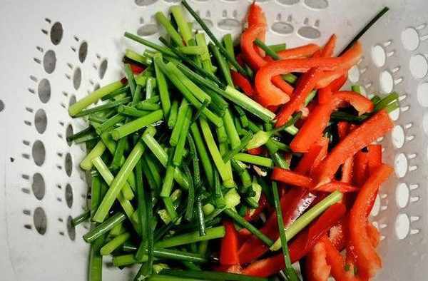 2、韭菜花洗干净切小段,红椒切丝备用。