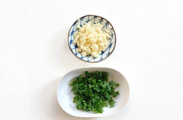 2、然后再把大蒜去皮,切成蒜粒,香葱洗干净,切成葱花,这里大蒜不建议减少用量,蒜香味浓一点,会更好吃