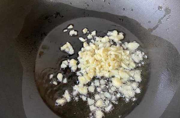 4、起锅烧油,把蒜粒下锅,小火炒出蒜香味来
