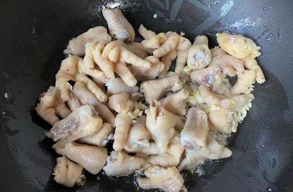 5、然后我们倒入鸡爪,转大火,翻炒片刻