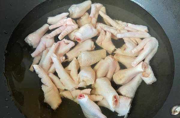 3、锅内倒入适量的水和料酒,把鸡爪倒入锅中,大火煮沸后,转中火焯烫3分钟,焯好捞出,清洗一遍待用
