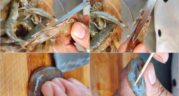 好啦!食材与配料已经写出来了,我们现在开始处理下虾吧,我们先将大虾清洗干净,然后用剪刀剪去虾腿和虾腔,然后在大虾背部划开一道口子,用牙签将黑线挑出。装盘备用。(如上图)