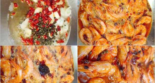 干锅香辣虾烹饪步骤二:锅中留适量底油,然后将葱、姜、蒜、干辣椒、花椒倒入,炒出香味后加入豆瓣酱,接着翻炒出红油后将处理好的大虾倒入锅中翻炒均匀。然后倒入啤酒,啤酒差不多快淹没大虾即可。然后撒上些许白糖、胡椒粉和一小汤匙蚝油,翻炒均匀后小火慢炖两分钟。