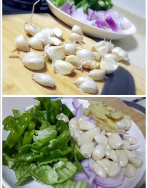 2.把大蒜剥好,生姜给切成条,青椒和紫洋葱也给切成片。