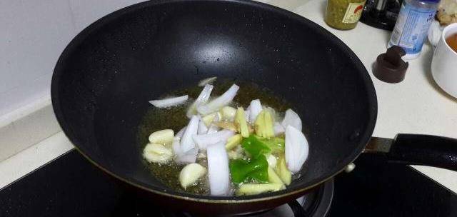 6.把油锅给清洗干净,再把大豆油给倒进去,把准备好的,青椒,姜条,大蒜头,洋葱给放进去进行煸炒。
