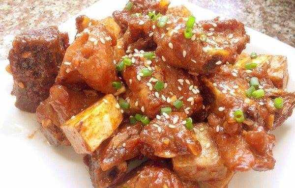 糖醋小排:小排洗净入锅煮沸焯水,倒入料酒去腥。热锅凉油加入葱姜爆香,加入小排翻炒至表面泛黄,按比例加入调味料,翻炒后加入凉白开淹过小排后盖上锅盖大火煮沸后小火慢慢收汁(可根据喜好增加糖、醋、和老抽),收到颜色汁水满意时盛出,撒上白芝麻,结束。
