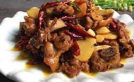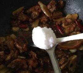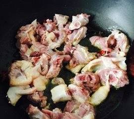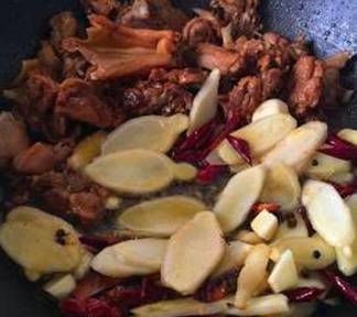 倒入子姜,干辣椒,花椒粒不断爆炒