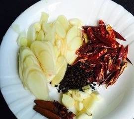 准备好子姜切片,多一点无妨,干辣椒剪段,蒜切好,花椒,八角桂皮