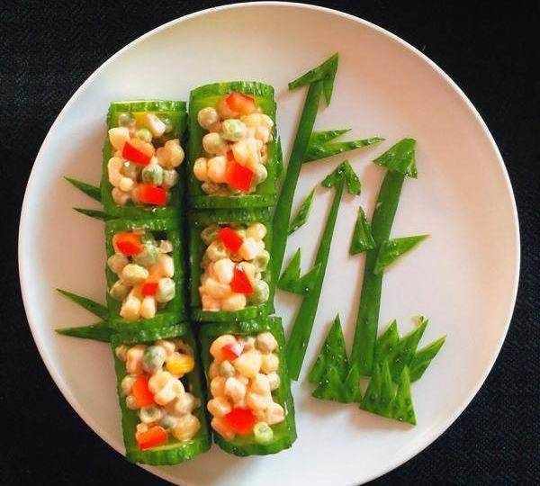 翠竹报春:鲜虾去虾线,剥成虾仁,加盐、料酒、生抽腌半小时,杂蔬焯水捞出,黄瓜切成同长短,然后挖空中间,做出“空心竹子”状,全部开水泡一下,然后摆成竹子的形状,挖出的黄瓜不要丢,切成小块,起油锅,下虾仁煸至变色,再将杂蔬、黄瓜块加入炒,调味后加入空心竹子里即成。