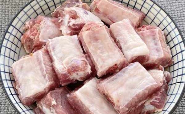 第二步:排骨买来切均匀小段,先用清水清洗一下,然后放入大盆中,放入没过排骨的清水,浸泡半小时,浸泡出多余的血水