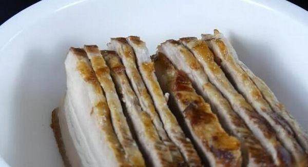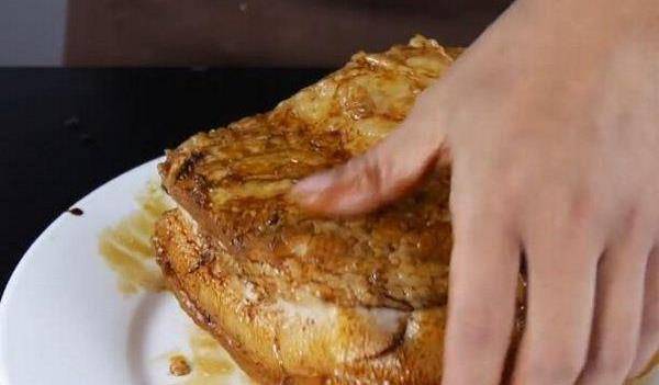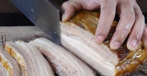 将炸好的五花肉切成厚度约为1公分的大块。