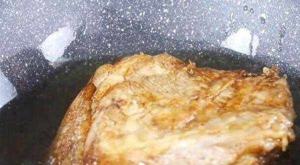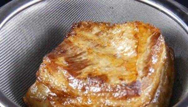 锅中倒入色拉油,加热至4到5成,猪皮朝下放入锅中。低油慢炸至肉块呈棕红色时即可。