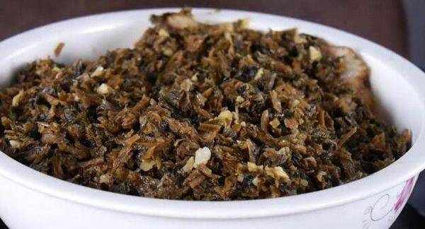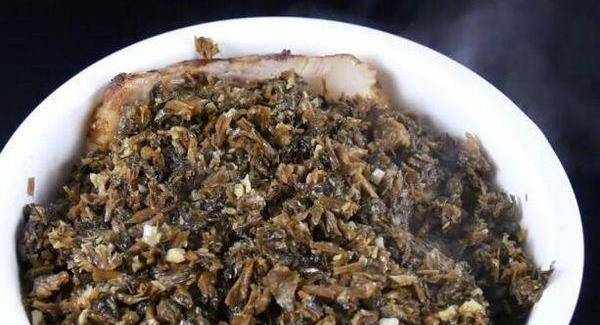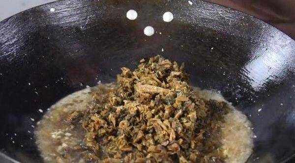 而后下切好的梅菜末炒均匀,小火烧片刻。
