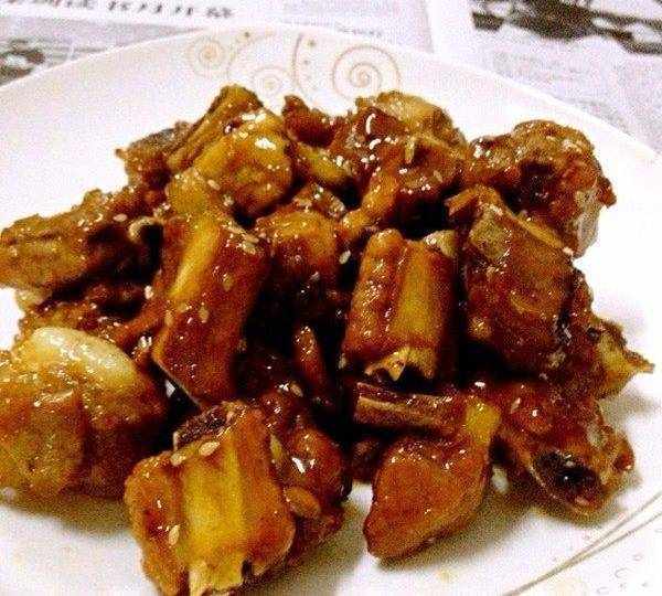 糖醋排骨:小排骨切小块,汆水去血沫,大约6成熟捞起来,锅里多点油,沥过水的排骨放下去炸,炸到表面金黄了,又捞起来。放在一边,锅里很多油,倒一些出来,留小部分,大约平时炒菜的量,放姜片炒香,放红糖小火炒化,排骨又丢进去,再扔一小把冰糖,炒啊炒啊,让糖都化了,粘粘乎乎了,放盐,鸡精,醋,粘粘乎乎的捣鼓几下,出锅啦,再撒上白芝麻即可。