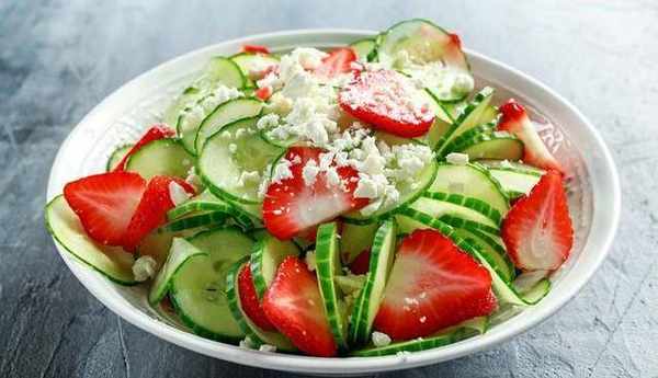草莓100克,黄瓜150克。白糖、白醋、盐、味精各适量。
