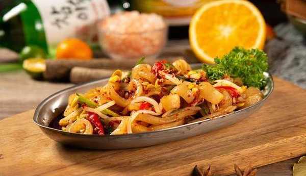 3.将大头菜洗净,切丝,用盐腌制一会,放入清水中洗净,捞出,沥去水分,加精盐、味精、辣椒油,拌匀,即为红油甘蓝。