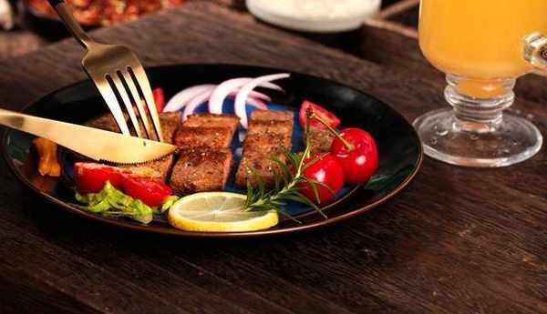 2.平底锅抹上黄油、橄榄油,将牛排煎熟后摆入盘中,以汆好的甜豆、胡萝卜片装饰即可。芥末装在小碗中,吃时蘸取。
