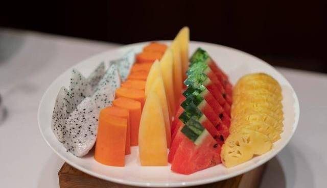 1.将西瓜在4/5处切开,掏出瓜瓤,去子切成小块;苹果、菠萝、梨、桃、樱桃、桂圆均切成小块。