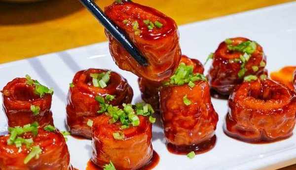 1.将猪硬肋肉洗净,切成4厘米宽的条,放入滚水锅内,煮至肉皮熟软、用筷子能插进皮内时,捞起,待凉后切成3毫米厚的片。