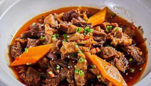 4.软烂的牛肉去掉葱、姜、桂皮和原汁一同倒入炒锅,放入青蒜、味精、胡椒粉煮滚,用生粉勾芡,淋入香油即可。