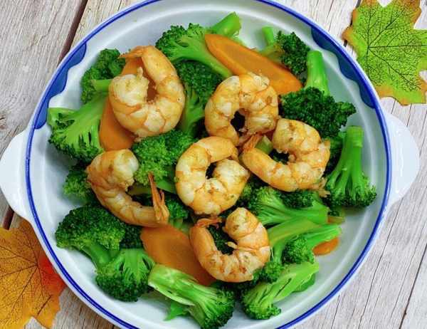 3、锅中下油爆香姜葱蒜,翻炒虾至变色,加入西兰花红萝卜,加1勺蚝油、少许盐翻炒均匀即可。