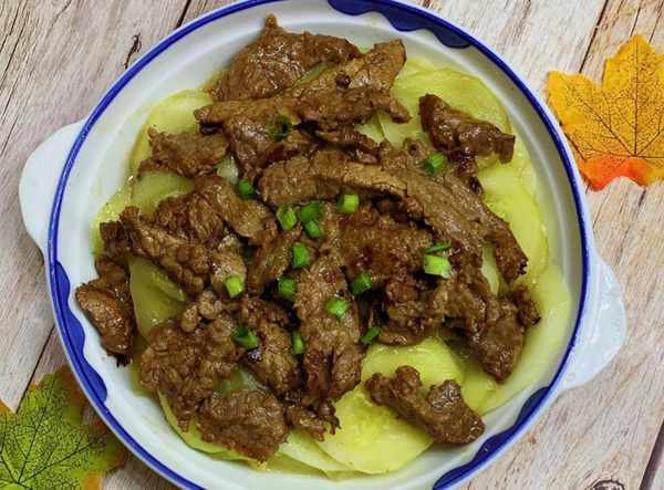 3、锅中下油煎香牛肉、7分熟就舀起来,再下油翻炒青瓜片刻把牛肉放下去,翻拌炒熟撒上葱花即可。
