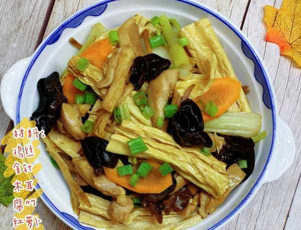 食材:鸡丝、金针、木耳、腐竹、红萝卜、芹菜