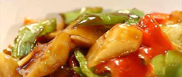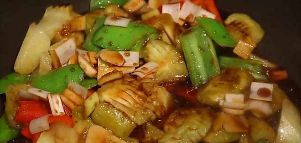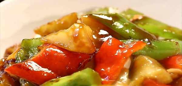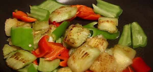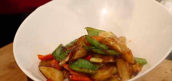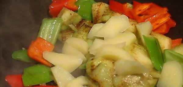 6、保持大火煎至茄子变软了、出现小焦状态后,放入青红椒简单翻炒。