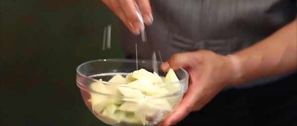 4、茄子入锅前,先撒上一些干淀粉,晃动碗让茄子均匀的裹上一层薄薄的干淀粉。裹淀粉是防止它过多地出水。