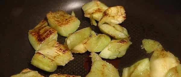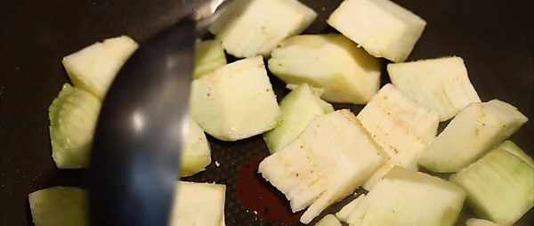 5、另起锅,倒入少许油,当油温达到六成热时,倒入茄子大火煎制。在煎制的过程中要不停翻动茄子,保持它受热均匀。