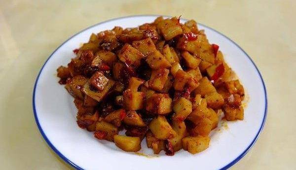 香辣藕丁:将藕洗净切丁浸泡在滴了几滴醋的清水里,姜切丝,葱切葱花,热锅热油,下老干妈油辣椒和姜丝炒香,然后入沥干水的藕丁大火翻炒,快炒熟的时候加一点生抽,加适量盐炒匀,可加一点清水大火收干,最后撒葱花出锅。