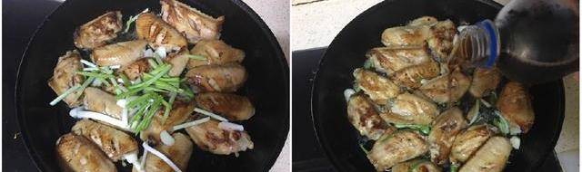 第三步:把准备的料放进去翻炒。葱白,姜片,蒜片,翻炒均匀以后,放食用盐,十三香粉,耗油。最后倒入准备好的可乐,可乐不要倒太多,刚好跟鸡翅平齐就可以了。
