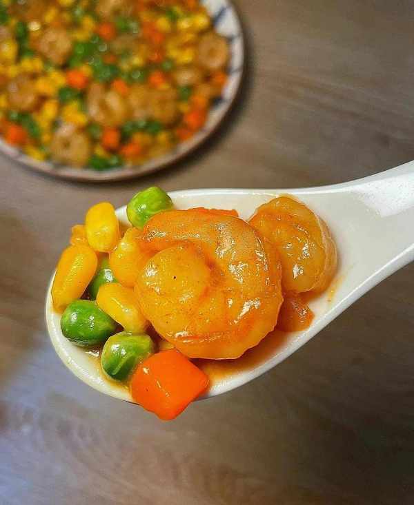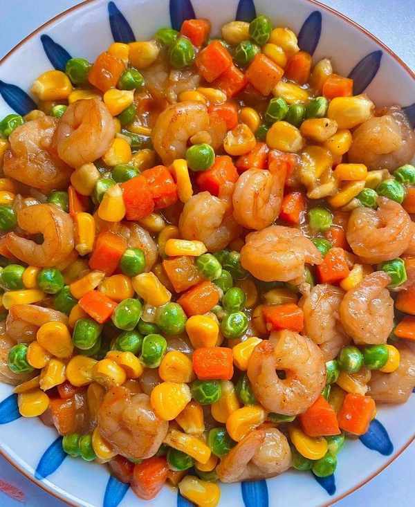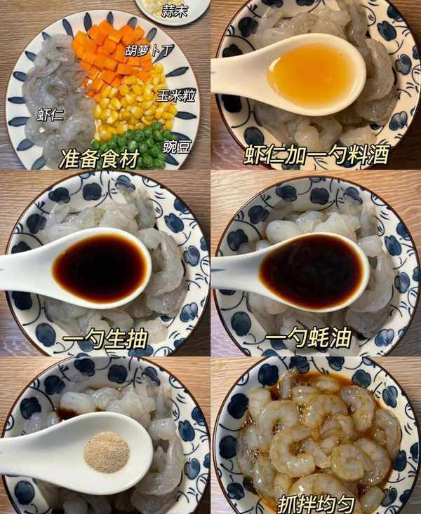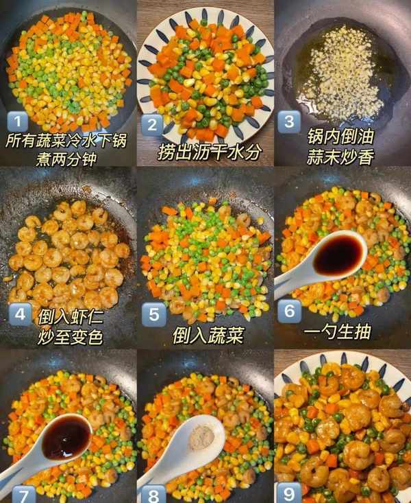 食材:虾仁、玉米粒、胡萝卜丁、青豌豆、蒜末。