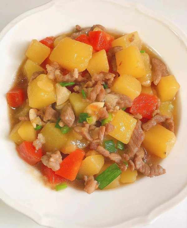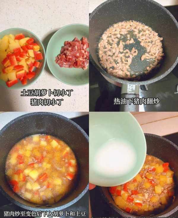 (2)热油下猪肉末翻炒,炒至变色后下入胡萝卜和土豆丁,加一勺酱油、适量水焖至土豆 软烂勾芡起锅。