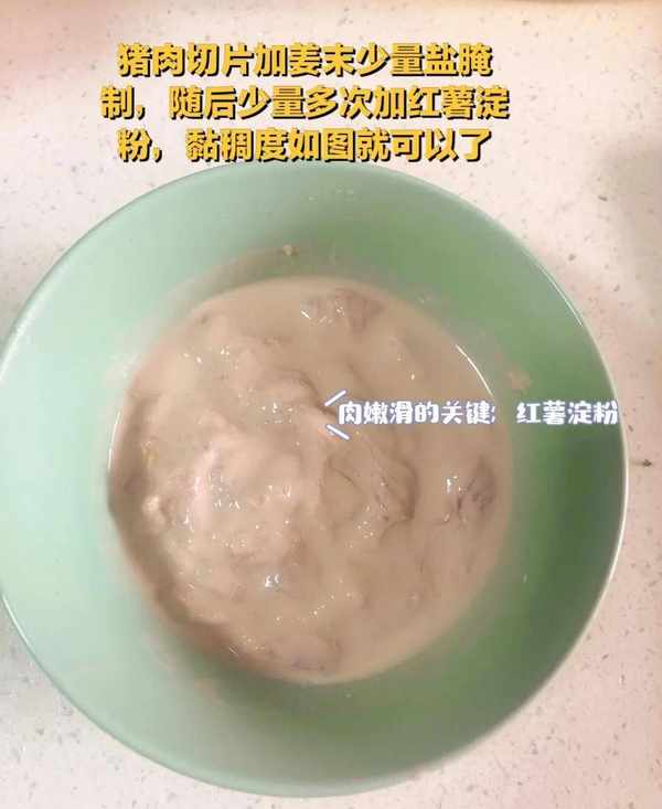 (1)先把猪肉切薄片,加葱末少量盐腌制,接着少量多次的加红薯淀粉;