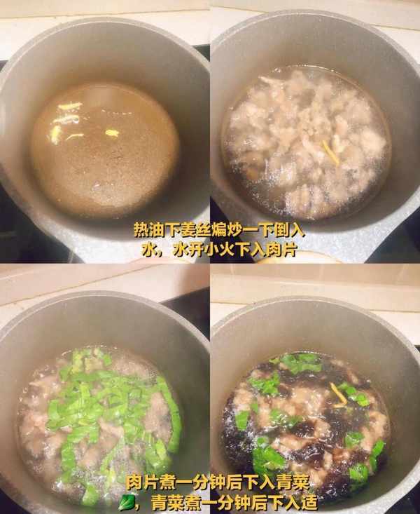 (2)锅内少许油下入姜丝倒入适量水,水开后小火下入肉片,均匀下入,不然要起坨;