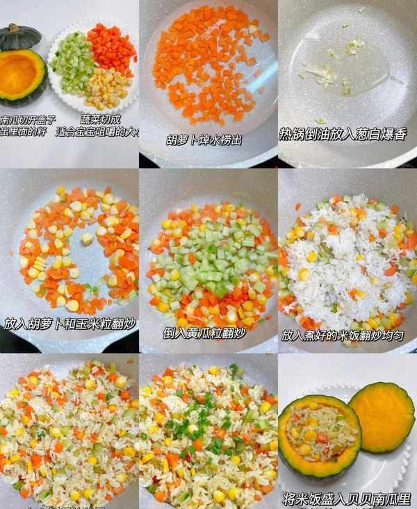 食材:贝贝南瓜一个、黄瓜、胡萝卜、玉米粒适量。