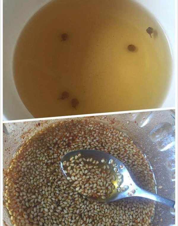 6、大料水的制作,这个是简易的大料水,就是将八角、花椒、桂皮、香叶、小茴香放到水里煮10分钟,然后放凉就可以了;油辣子是用少许的辣椒面、花椒面、芝麻,以及一点盐,放一点水拌湿,然后倒入冒烟的油中即可。