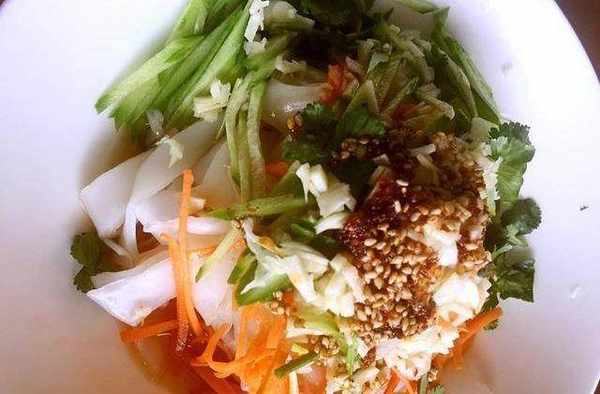7、将胡萝卜、黄瓜切丝,蒜切末,醋、酱油、盐、大料水、辣子油等全部浇在凉皮上。