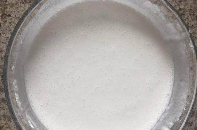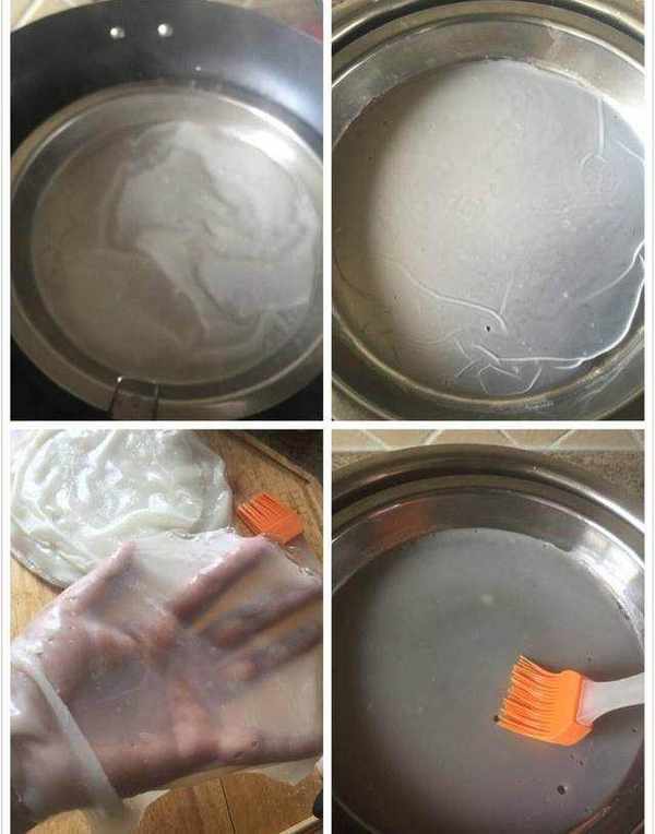 4、当凉皮起泡的时候取出来放到提前准备好的凉水里降温,然后再取出,在凉皮上刷一层油,以防凉皮粘在一起。