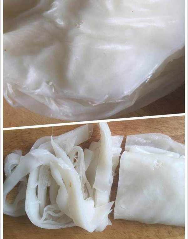 5、将凉皮一张张摞在一起,切成条备用。