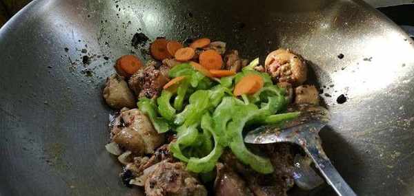 4)加入苦瓜和红萝卜片炒一下。