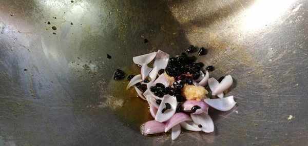 2)烧少许油,爆香蒜蓉,洋葱头和豆豉。