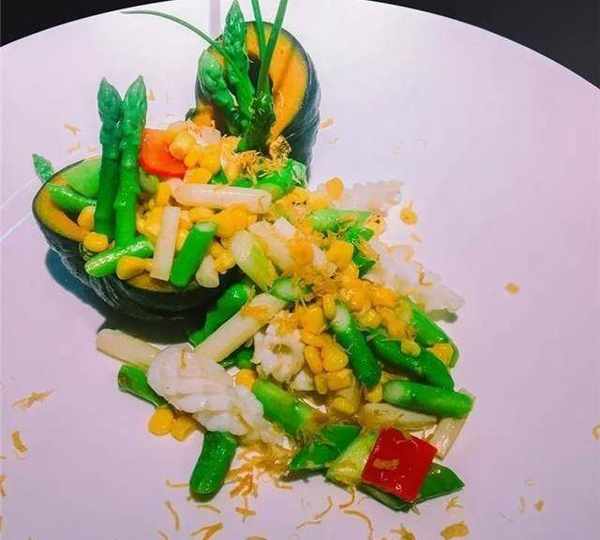 鲜芦笋200克,玉米粒50克,红椒10克,洪湖莲藕尖20克,鲜鱿鱼10克,炸瑶柱碎少许。