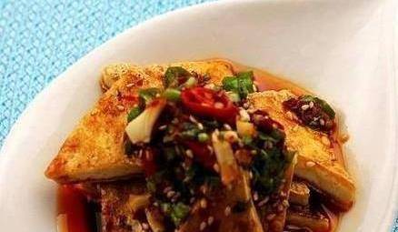6、然后分别加辣椒油、生抽、盐、糖、香油、鱼露,充分搅拌均匀后淋入煎好的豆腐片上即可。