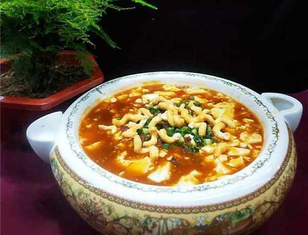 2、热锅,倒入两炒勺熬好的汤,调入盐、鸡粉、味精,喷入黑醋,待汤汁烧开后勾芡汁(芡不能太清),然后取内脂豆腐下入锅内,用锅铲将豆腐分成不规则的块状,然后轻轻推匀豆腐(不能炒碎)至完全挂味,盛出装盘,撒上B料即可上桌。