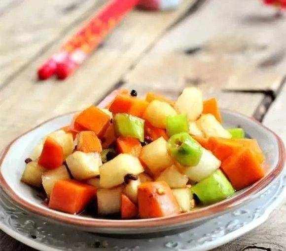 1、白萝卜、胡萝卜去皮切成指头大小丁,樱桃小萝卜切成指头大小丁。