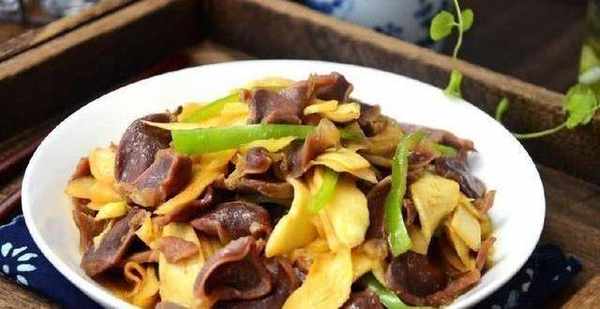 2.茭白切片备用,锅热油放入姜丝炒香,放入鸡胗翻炒,锅中加入生抽、料酒和糖大火爆炒2分钟。