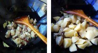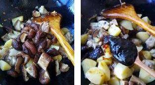 5、倒入土豆块翻炒至变色后加入泡好的香菇炒匀。