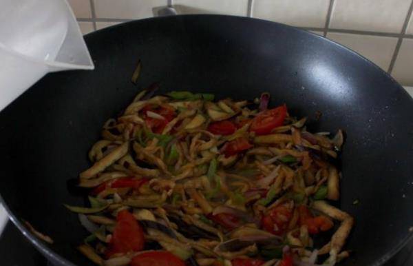 然后,放入茄子小火翻炒,把茄子彻底炒软,倒入老抽生抽继续翻炒均匀。然后加入水没过茄子1cm,放一个八角,炖5分钟。
